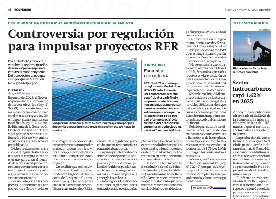 En ese contexto, el 2 de febrero de 2026 el portal Infobae publicó el artículo “¿Lima a oscuras? Experto alerta riesgo de cortes en la capital y el sur del país por masiva irrupción de renovables sin respaldo”. Al día siguiente, el 3 de febrero, el diario Gestión difundió el artículo “Solares y eólicas en medio del debate’: ¿regulación para impulsarlas afectará las tarifas de luz?”. Finalmente, el 8 de febrero, La República abordó el tema en el artículo “La nueva ley eléctrica tensiona al sector por precios y continuidad del servicio”. En los tres artículos se recogen las declaraciones del Dr. Arturo Vásquez Cordano, Profesor Principal y Director de Investigación de la Escuela de Postgrado GĚRENS y exviceministro de Energía, quien realiza un análisis crítico del diseño propuesto para las nuevas licitaciones eléctricas que atenderán la demanda del mercado regulado (donde se encuentran los consumidores domésticos). A continuación, se sistematizan los principales cuestionamientos técnicos y regulatorios planteados por el experto.