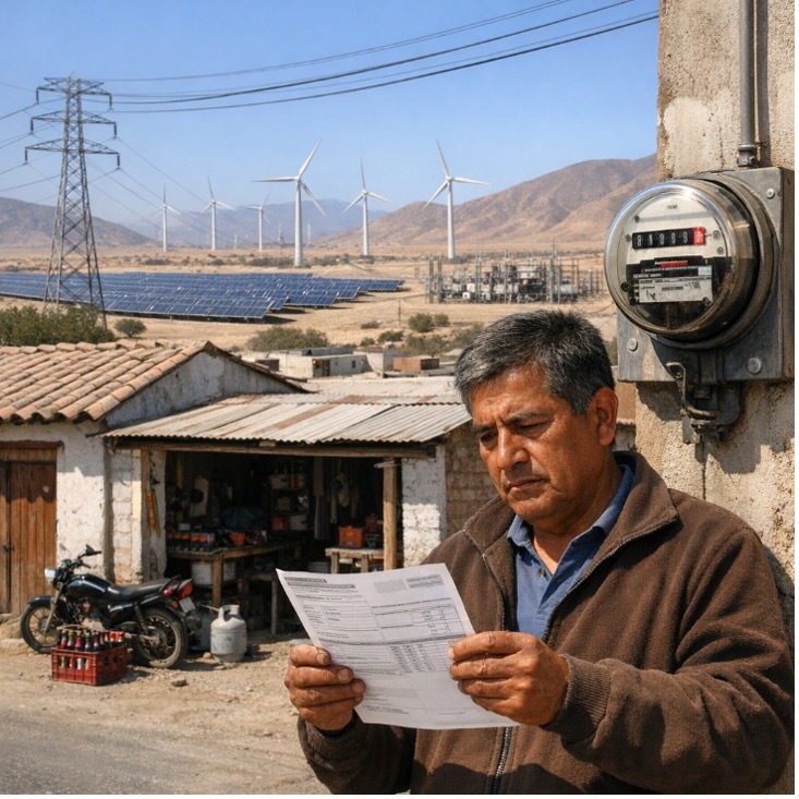 De acuerdo con el análisis del Dr. Arturo Vásquez, en el sur del Perú la expansión de energías renovables sin suficiente respaldo de potencia firme, el fortalecimiento de la transmisión eléctrica y la provisión suficiente de servicios complementarios puede traducirse en mayores costos para hogares y pequeños negocios, reflejándose directamente en las tarifas eléctricas. Ilustración: DI-EPG GĚRENS, con asistencia de DALL-E.
