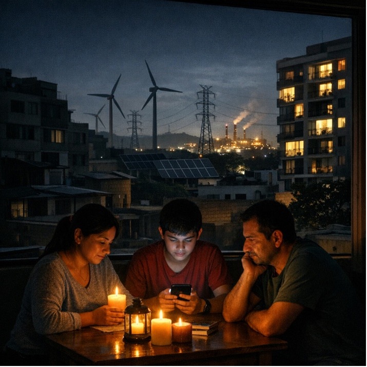 La incorporación acelerada de energías renovables a través de licitaciones de bloques horarios sin respaldo de potencia firme en el mercado peruano puede afectar la seguridad del suministro eléctrico, especialmente durante la noche, cuando el consumo residencial sigue activo. Cuando la electricidad no está garantizada las 24 horas, la vida cotidiana se apaga: un sistema eléctrico con energías renovables sin suficiente respaldo puede poner en riesgo el suministro de los hogares, afirma el Dr. Arturo Vásquez. Ilustración: DI-EPG GĚRENS, con asistencia de DALL-E.