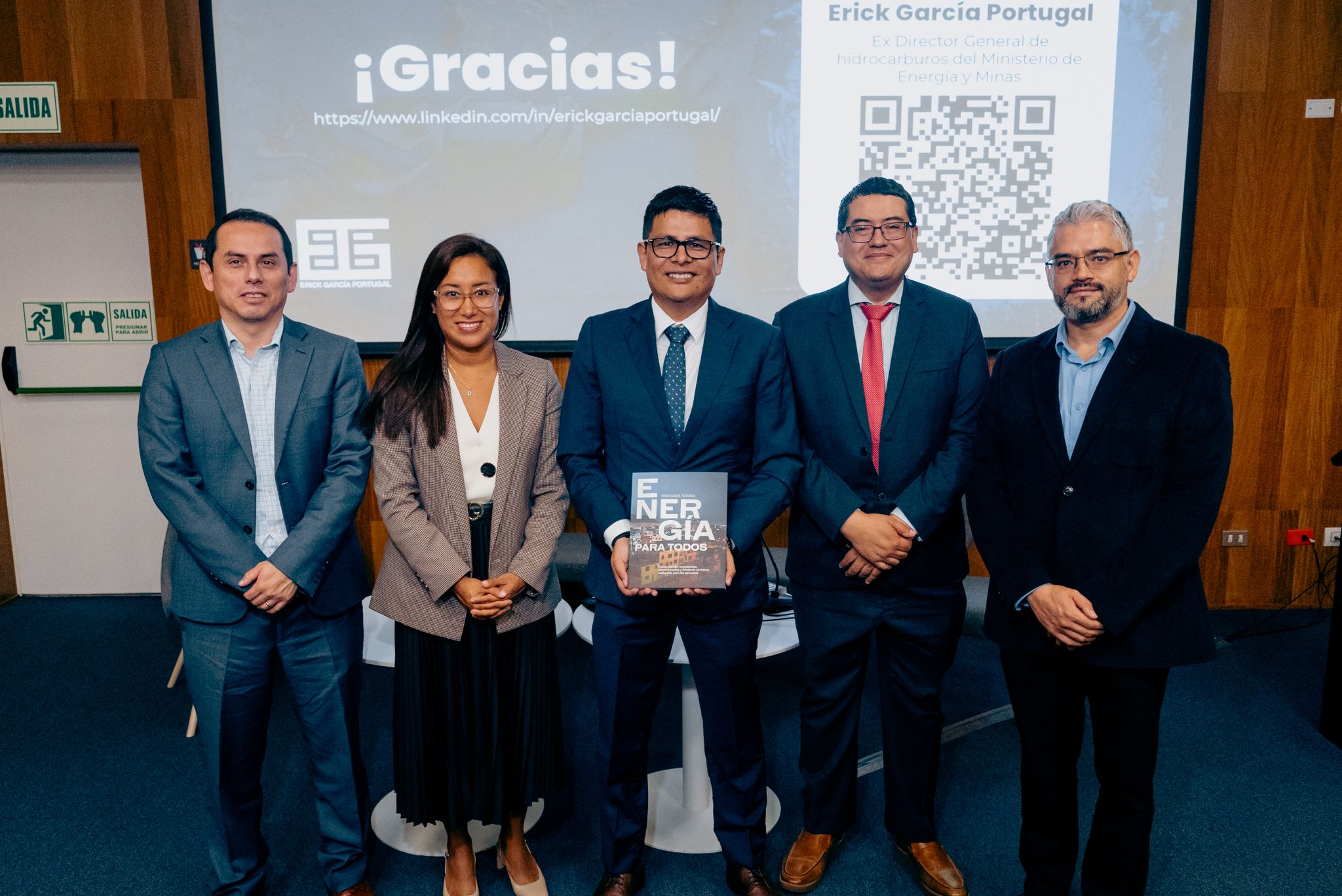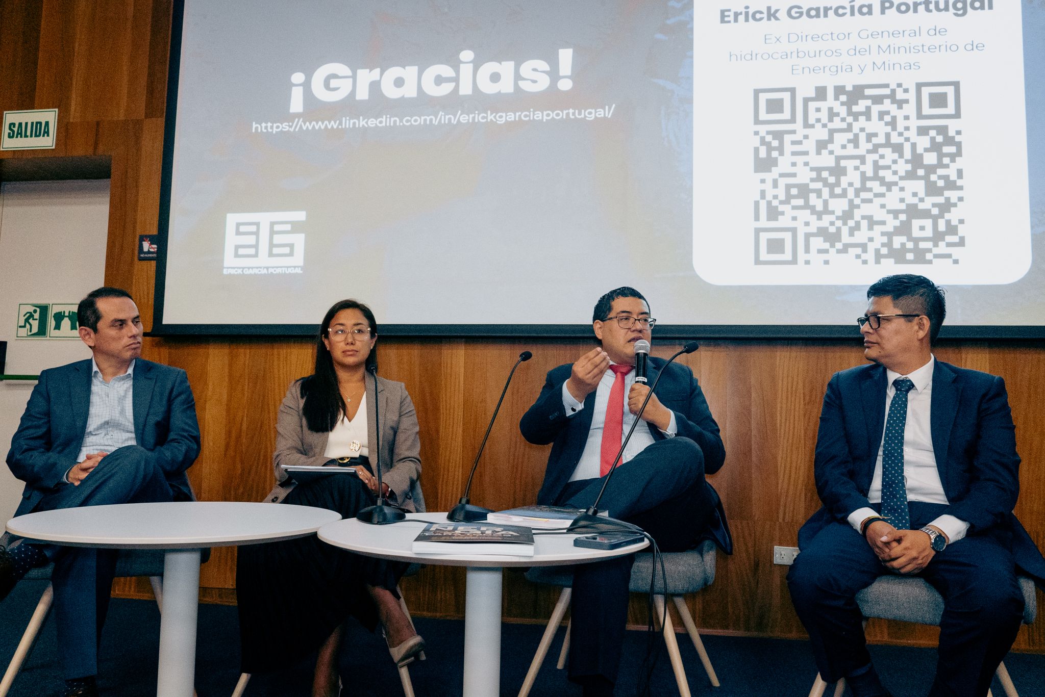 El Dr. Vásquez en la mesa panel conformada por del Ing. Erick García, Solange Cuadros y Carlos Gallardo, durante una presentación del libro “Energía para todos: Cómo atender necesidades, cerrar brechas y construir un futuro sostenible para los peruanos”.