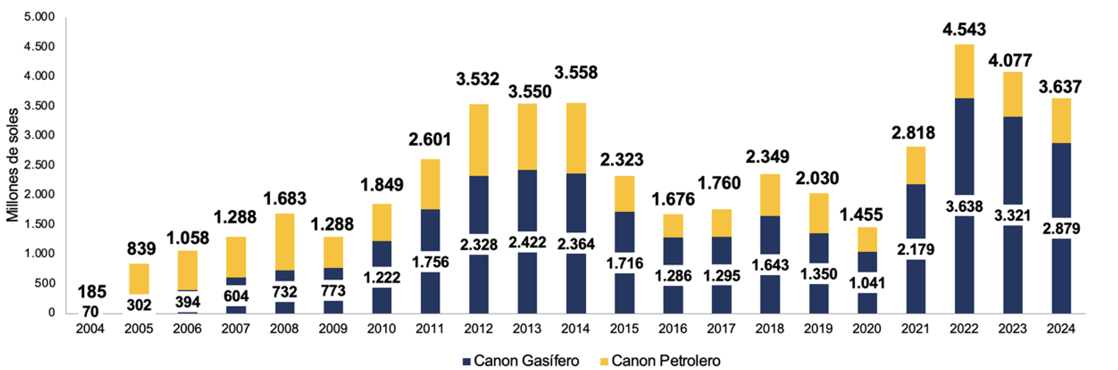 Ilustración 2‑3 – Evolución histórica del canon y sobrecanon petrolero y gasífero distribuido a los gobiernos subnacionales